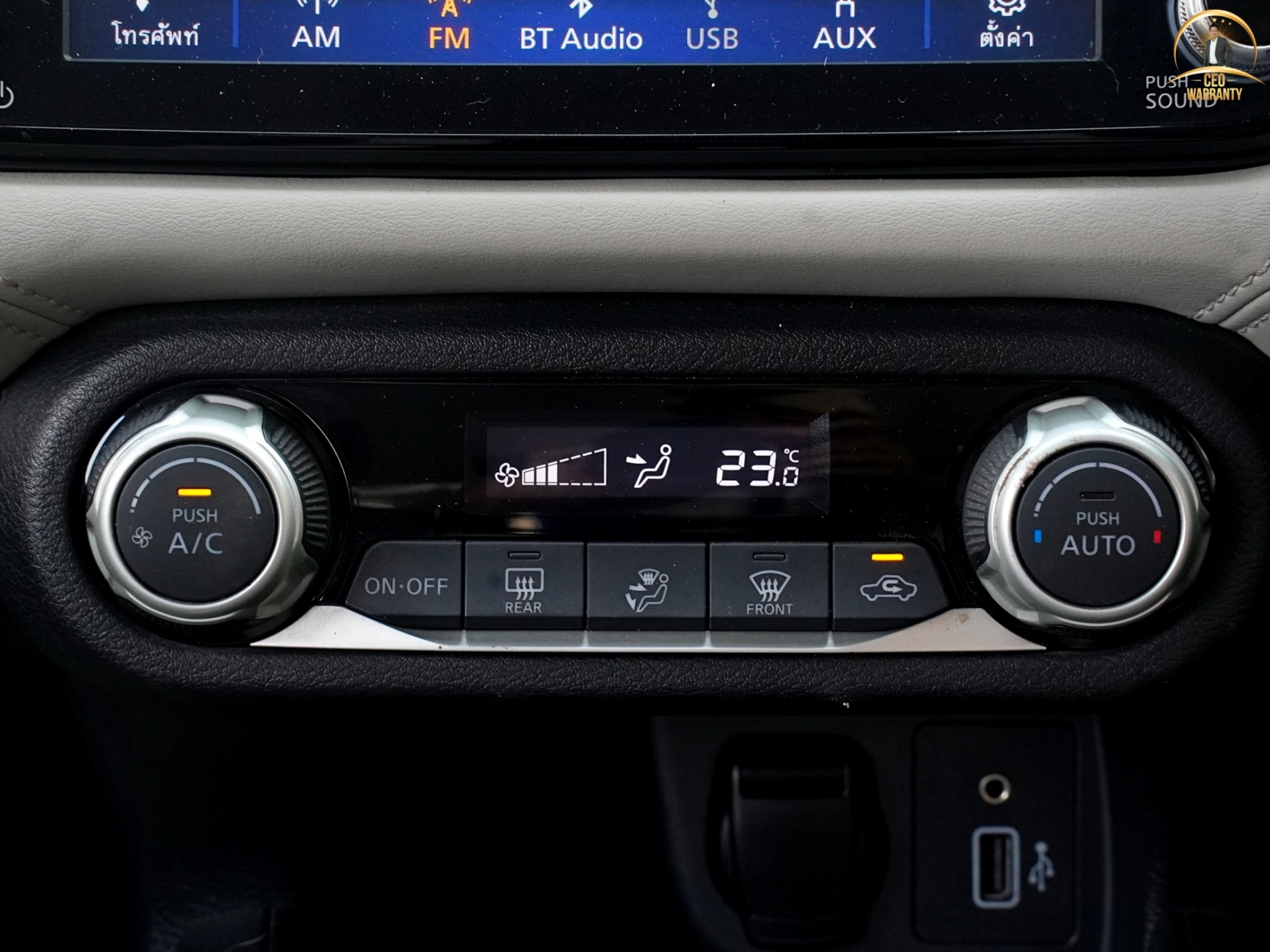� ข้อมูลทางเทคนิคและออพชั่นรุ่น VLหัวข้อรายละเอียดเครื่องยนต์1.0 ลิตร Turbo แรงม้าสูงสุด 100 HP / แรงบิด 152 นิวตัน-เมตรความประหยัดอัตราสิ้นเปลืองเชื้อเพลิงสูงสุด 23.3 กม./ลิตรเทคโนโลยีNissan Intelligent Mobility (กล้องรอบทิศทาง 360 องศา)ภายในเบาะหนัง/หนังสังเคราะห์เดินด้ายเทา, แอร์อัตโนมัติ, จอ TFT 7 นิ้วความบันเทิงจอสัมผัส 8 นิ้ว รองรับ Apple CarPlay และ Bluetoothความปลอดภัยเทคโนโลยีเตือนวัตถุเคลื่อนไหวรอบคัน, ไฟหน้า LED พร้อม Signature Light