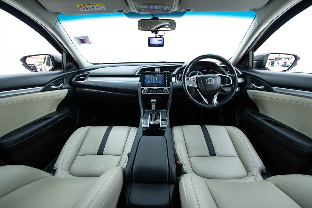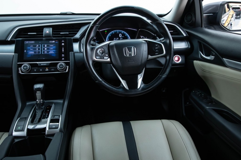 ภายในห้องโดยสาร โทนสีเบจ พวงมาลัยหุ้มด้วยหนัง แบบสปอร์ตท้ายตัด D-Cut พวงมาลัย ปรับระดับได้ 4 ทิศทาง (ขึ้น-ลง-เข้า-ออก) หน้าจอแสดงข้อมูลการขับขี่ TFT 3D Meter แบบสี ปุ่ม ECO Mode