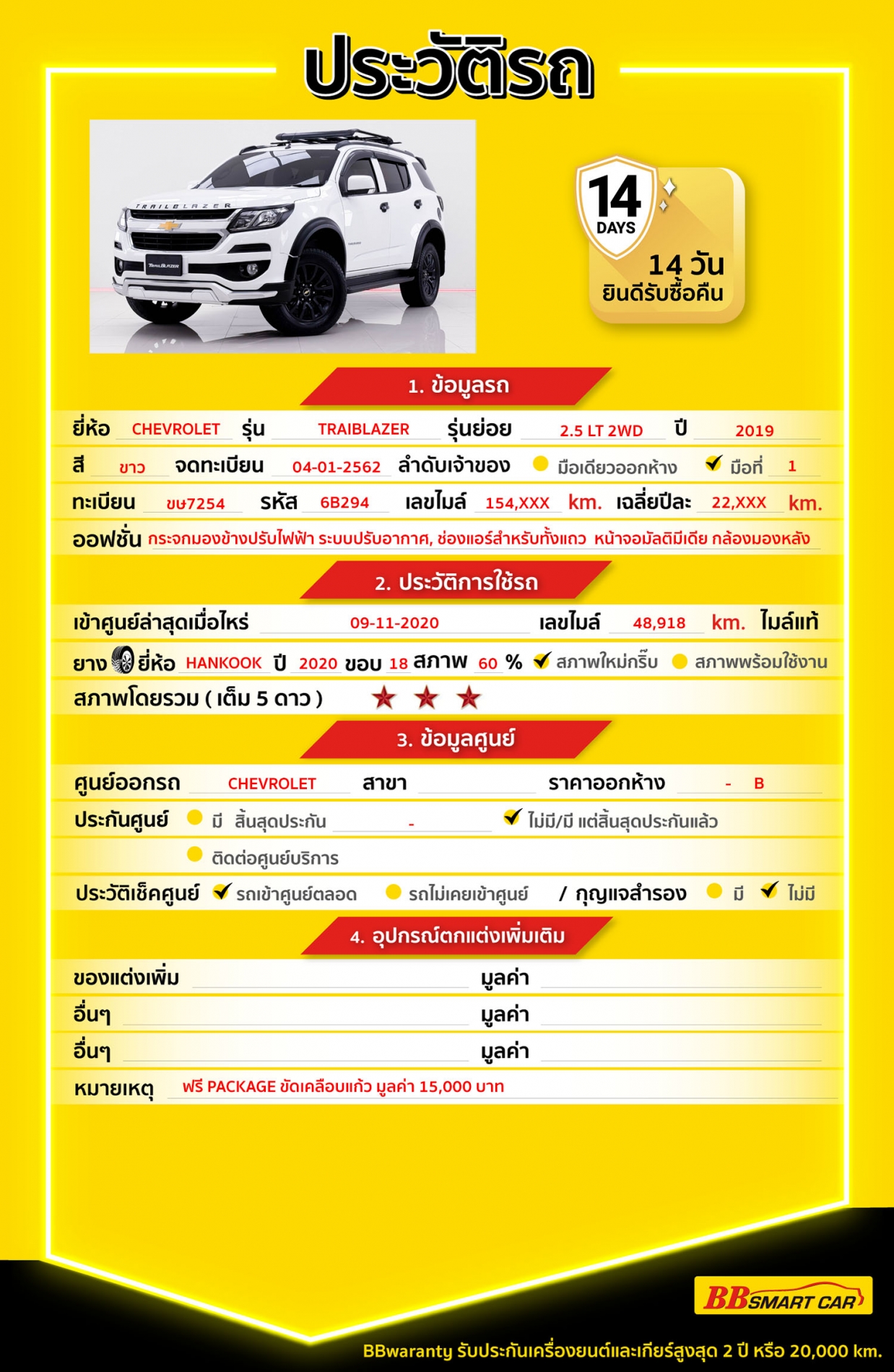 การรับประกันหลังการขาย BB Care Plus สูงสุด 2 ปี หรือ 20,000 km. ด้วยช่างที่ผ่านการอบรมจากศูนย์ชั้นนำของประเทศ