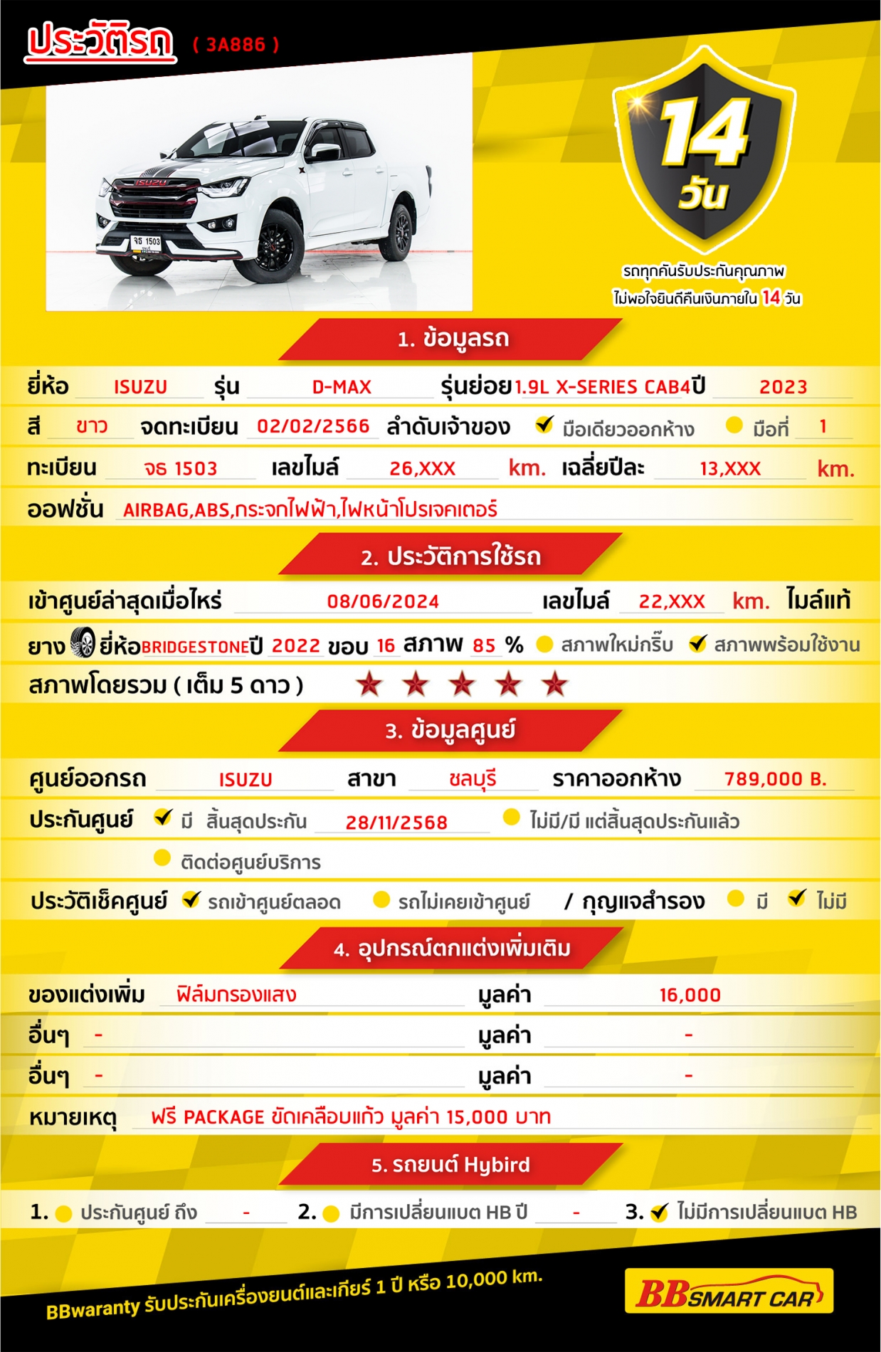 - BB Care Plus รับประกันหลังการขาย สูงสุด 2 ปี หรือ 20,000 km.