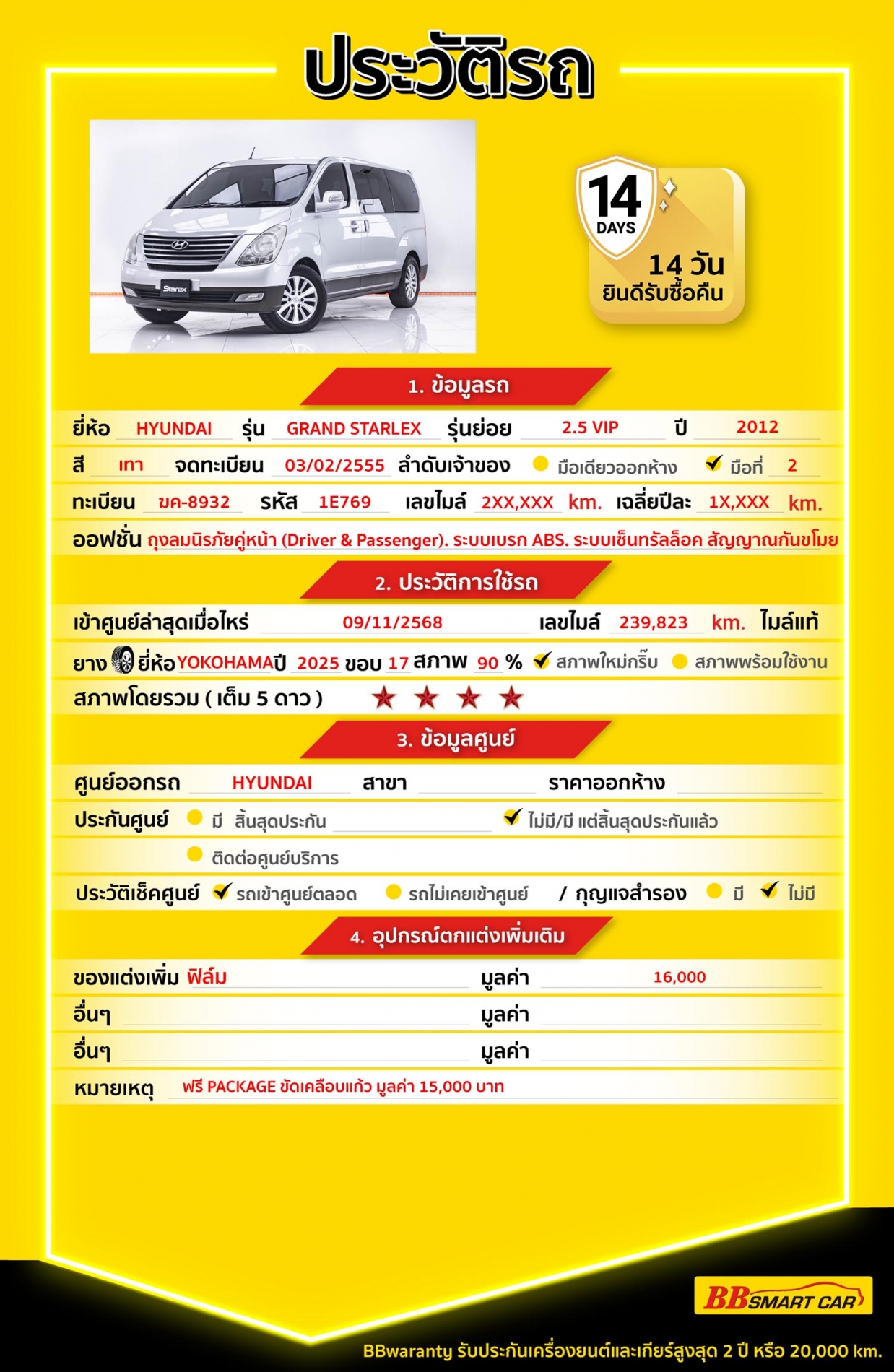 - รับประกันไมล์แท้ 100% กรณีตรวจพบการกรอไมล์ ยินดีคืนเงินเต็มจำนวน