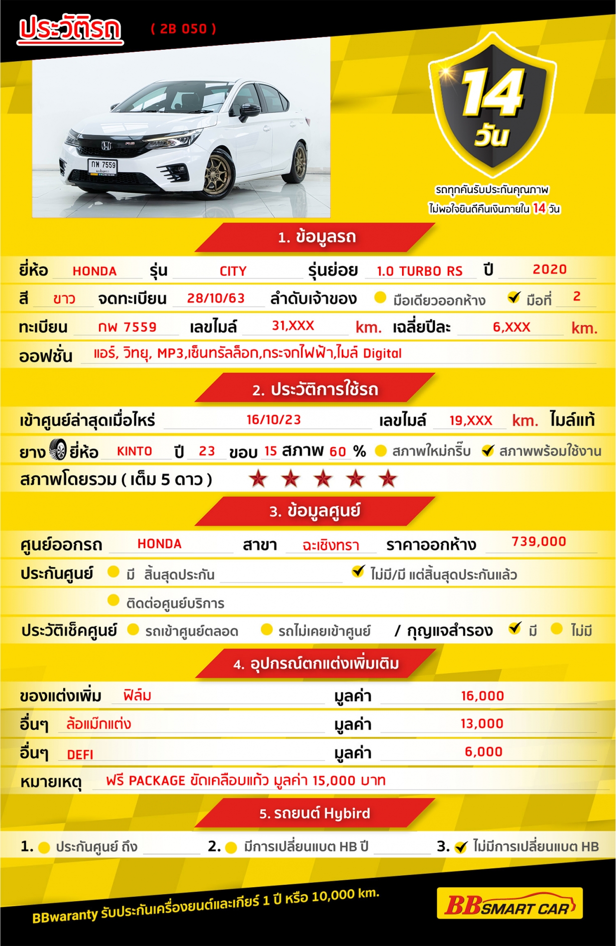 HONDA CITY 1.0 RS 4DR AT 2020 ออกรถ 0 บาท จัดได้ 449,000 บ Line : @bbcar02