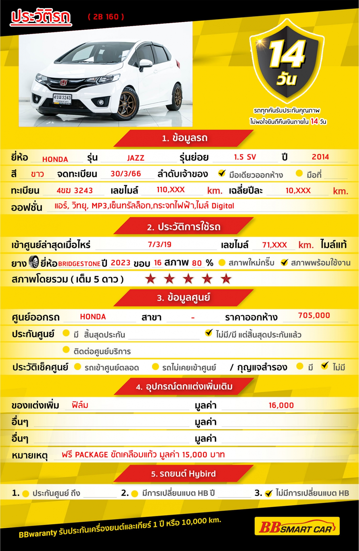HONDA JAZZ 1.5 SV AT 2014 ออกรถ 0 บาท จัดได้ 364,000 บ Line : @bbcar02