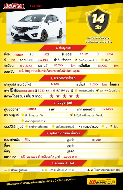การรับประกันหลังการขาย BB Care Plus สูงสุด 2 ปี หรือ 20,000 km. ด้วยช่างที่ผ่านการอบรมจากศูนย์ชั้นนำของประเทศ
