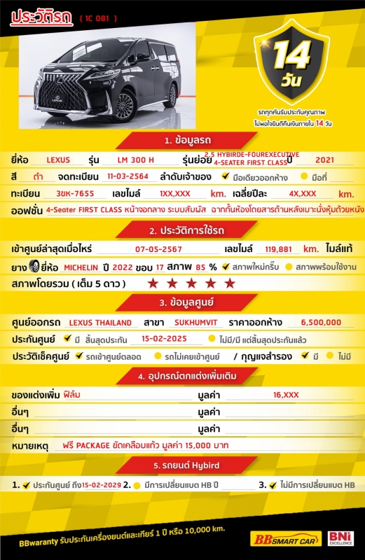 - การรับประกันหลังการขาย BB Care Plus สูงสุด 2 ปี หรือ 20,000 km. ด้วยช่างที่ผ่านการอบรมจากศูนย์ชั้นนำของประเทศ