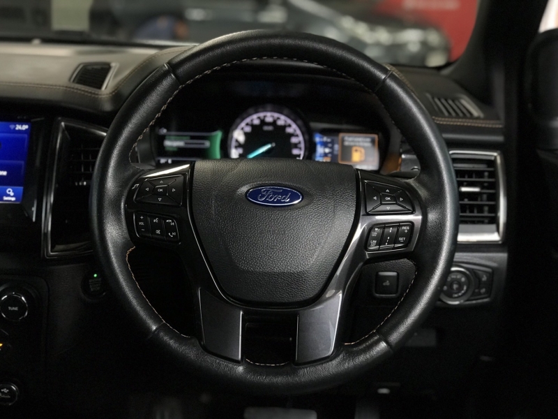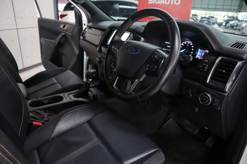การตกแต่งภายในของรุ่น Wildtrak ที่เน้นตกแต่งสไตล์สปอร์ต ภายในโทนเข้มสีดำ ที่สลับกับการเดินตะเข็บสีส้มทั้งส่วนของคอนโซลหน้า พวงมาลัย และเบาะที่นั่ง และฟังชั่นจัดมาเต็มครับ พวงมาลัย MULTIFUNTION สามารถทำได้ครบทุกอย่างเลยครับ จอสีแบบสัมผัส Muiti-Touch รองรับระบบนำทาง Navigation ระบบเชื่อมต่อบลฺทูธ และระบบ Infotainment SYNC 3 สามารถสั่งการระบบเครื่องเสียง ภาษาไทยได้ ไม่ว่าจะเป็นการสั่งโทรออก เล่นเพลงจากสื่อต่างๆ บอกตัวเลขคลื่นวิทยุ สั่งเล่นเพลงจาก USB ค้นหาเพลง รวมไปถึงการปรับอุณหภูมิโดยบอกเป็นตัวเลของศาได้เลยครับ