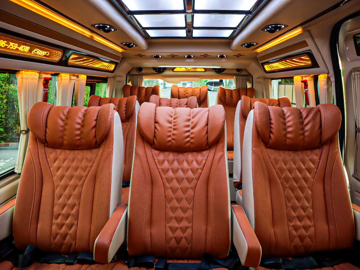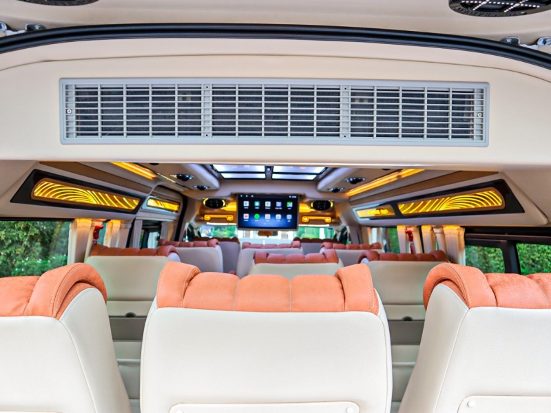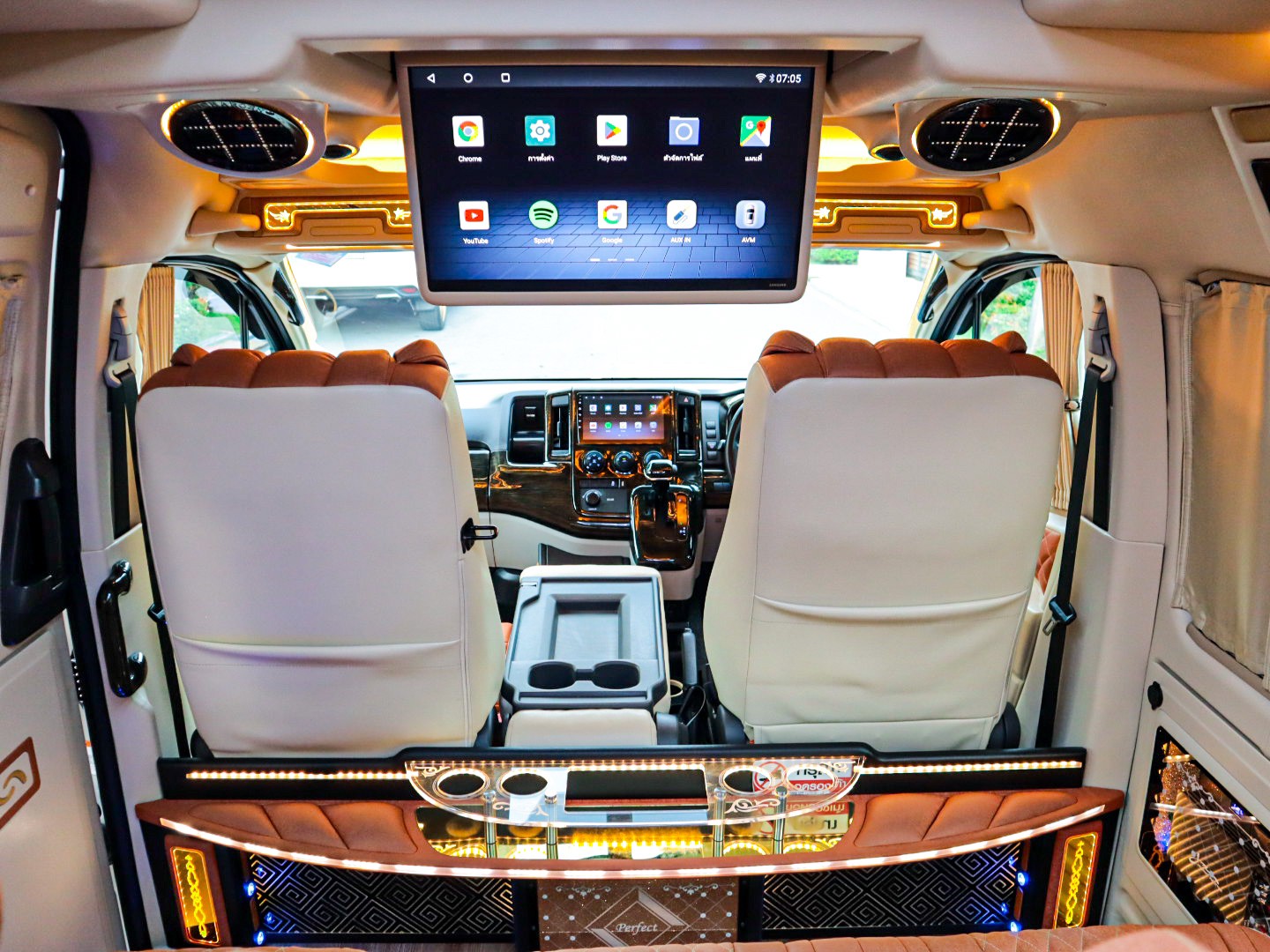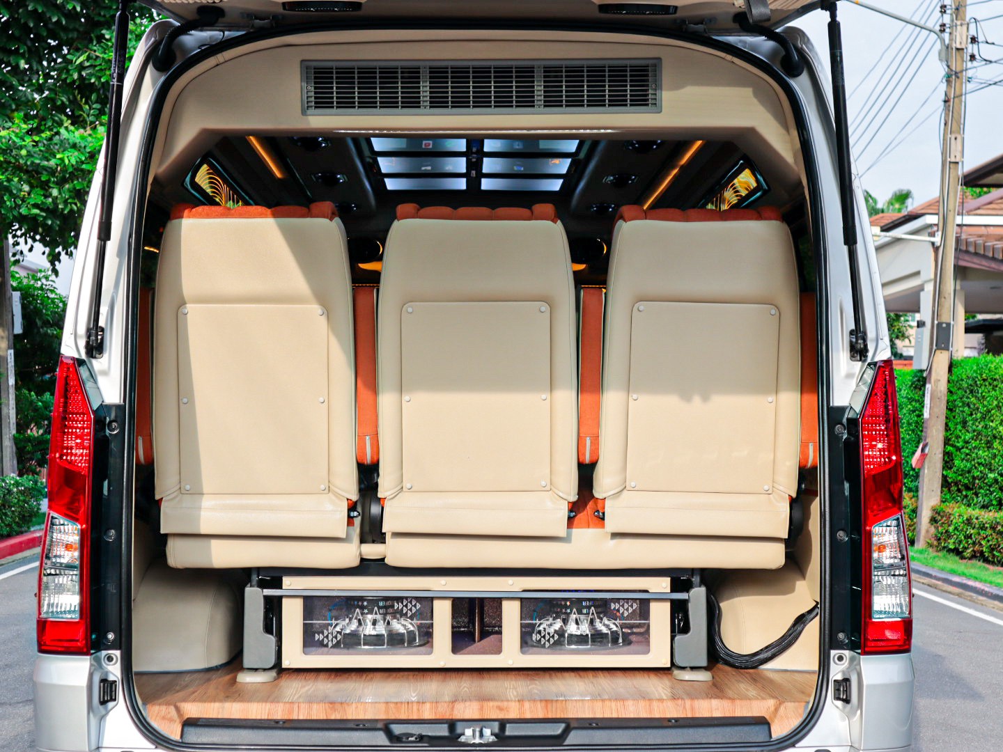 เบาะสีส้มตัดครีม 3 แถว 9 ที่นั่ง มีที่พักแขนเบลวล่าง