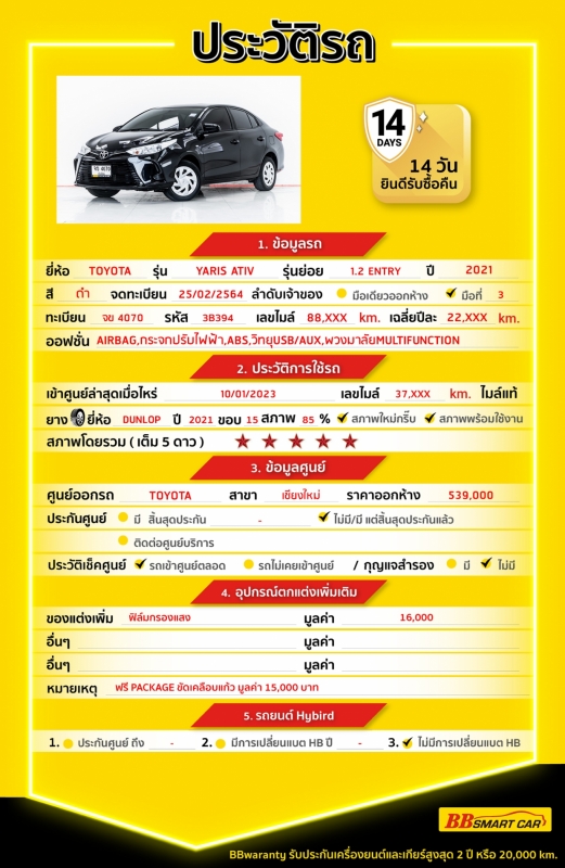 - การรับประกันหลังการขาย BBwarranty ดูแลเครื่องยนต์และเกียร์ นาน 2 ปี หรือ 20,000 กิโลเมตร ด้วยช่างที่ผ่านการอบรมจากศูนย์ชั้นนำของประเทศ