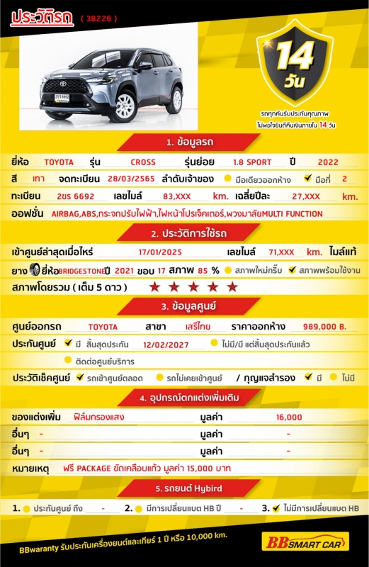 - BB Care Plus รับประกันหลังการขาย สูงสุด 2 ปี หรือ 20,000 km.