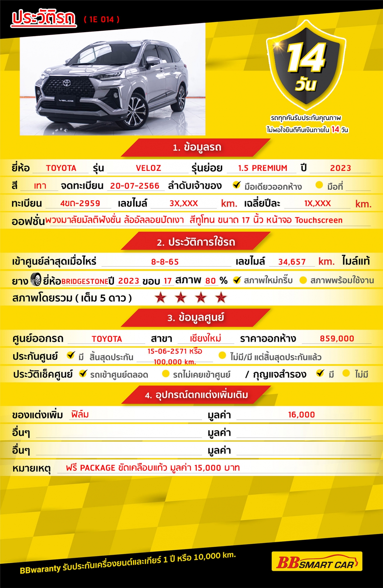 - BB Care Plus รับประกันหลังการขาย สูงสุด 2 ปี หรือ 20,000 km.