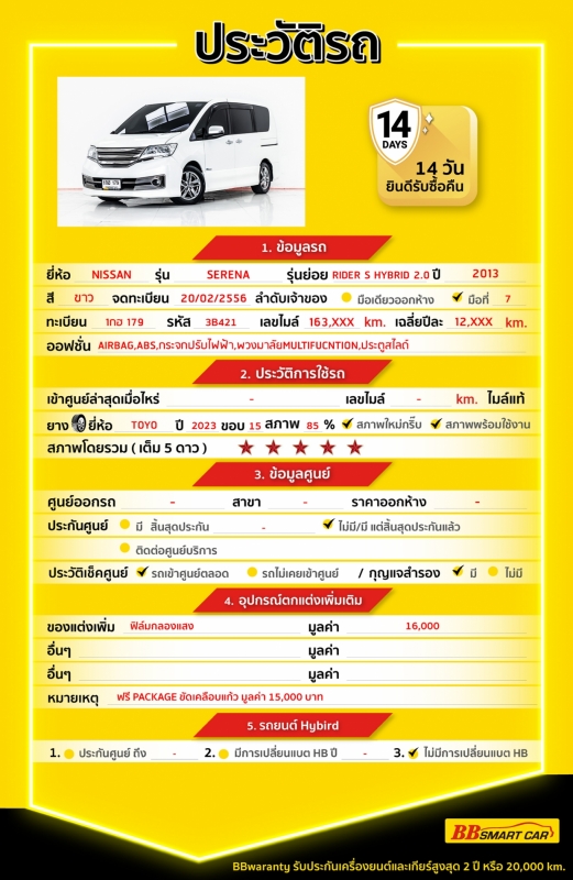 - การรับประกันหลังการขาย BBwarranty ดูแลเครื่องยนต์และเกียร์ นาน 2 ปี หรือ 20,000 กิโลเมตร ด้วยช่างที่ผ่านการอบรมจากศูนย์ชั้นนำของประเทศ