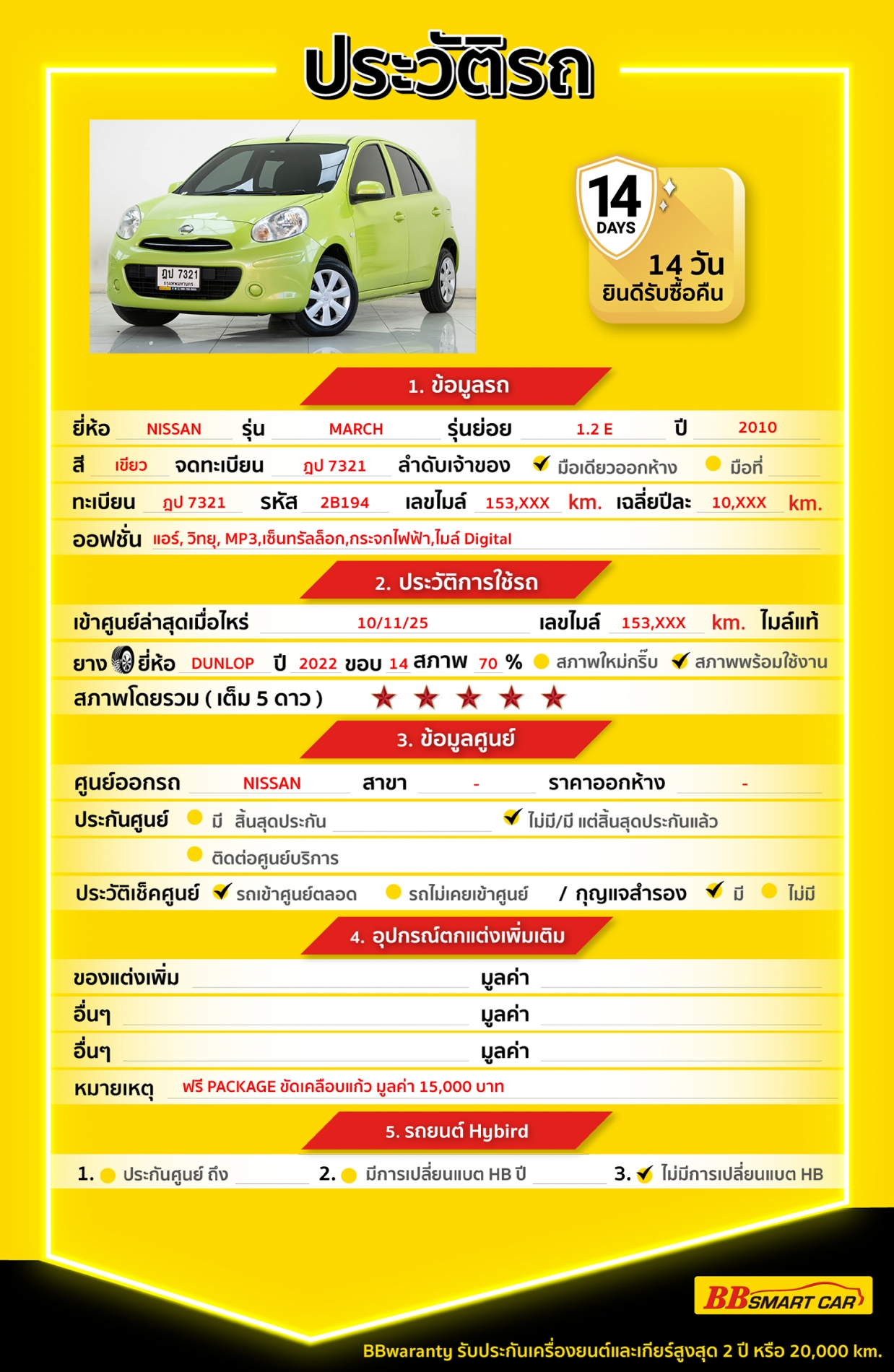 การรับประกันหลังการขาย BB Care Plus สูงสุด 2 ปี หรือ 20,000 km. ด้วยช่างที่ผ่านการอบรมจากศูนย์ชั้นนำของประเทศ
