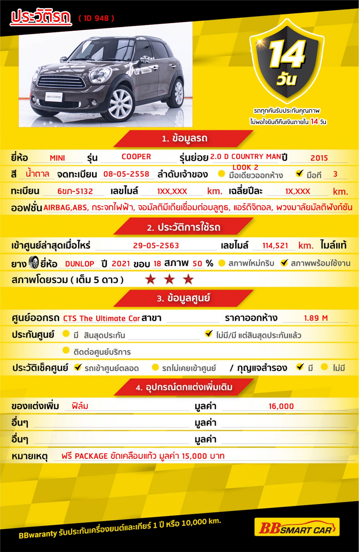 - การรับประกันหลังการขาย BB Care Plus สูงสุด 2 ปี หรือ 20,000 km. ด้วยช่างที่ผ่านการอบรมจากศูนย์ชั้นนำของประเทศ
