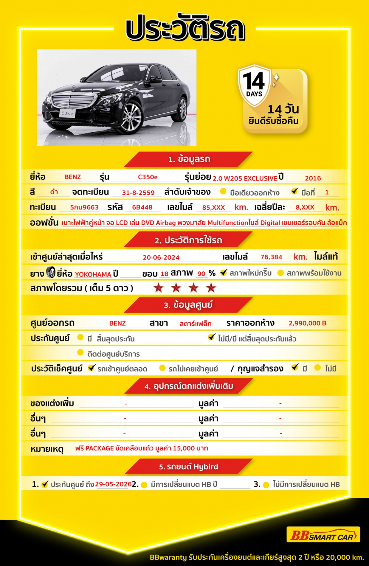 MERCEDES-BENZ C-CLASS C350E EXCLUSIVE W205 ปี 2016 แท้ วิ่งใช้งานเพียง 85,000 KM. ระบบเกียร์อัตโนมัติ 7G-Tronic Plus เข้าศูนย์ตลอด เป็นรถศูนย์แท้จาก MERCEDES-BENZ ประวัติดี ไม่มีอุบัติเหตุ สภาพพร้อมใช้งาน ประหยัดจากป้ายแดงได้มากถึง 2 ล้านบาท