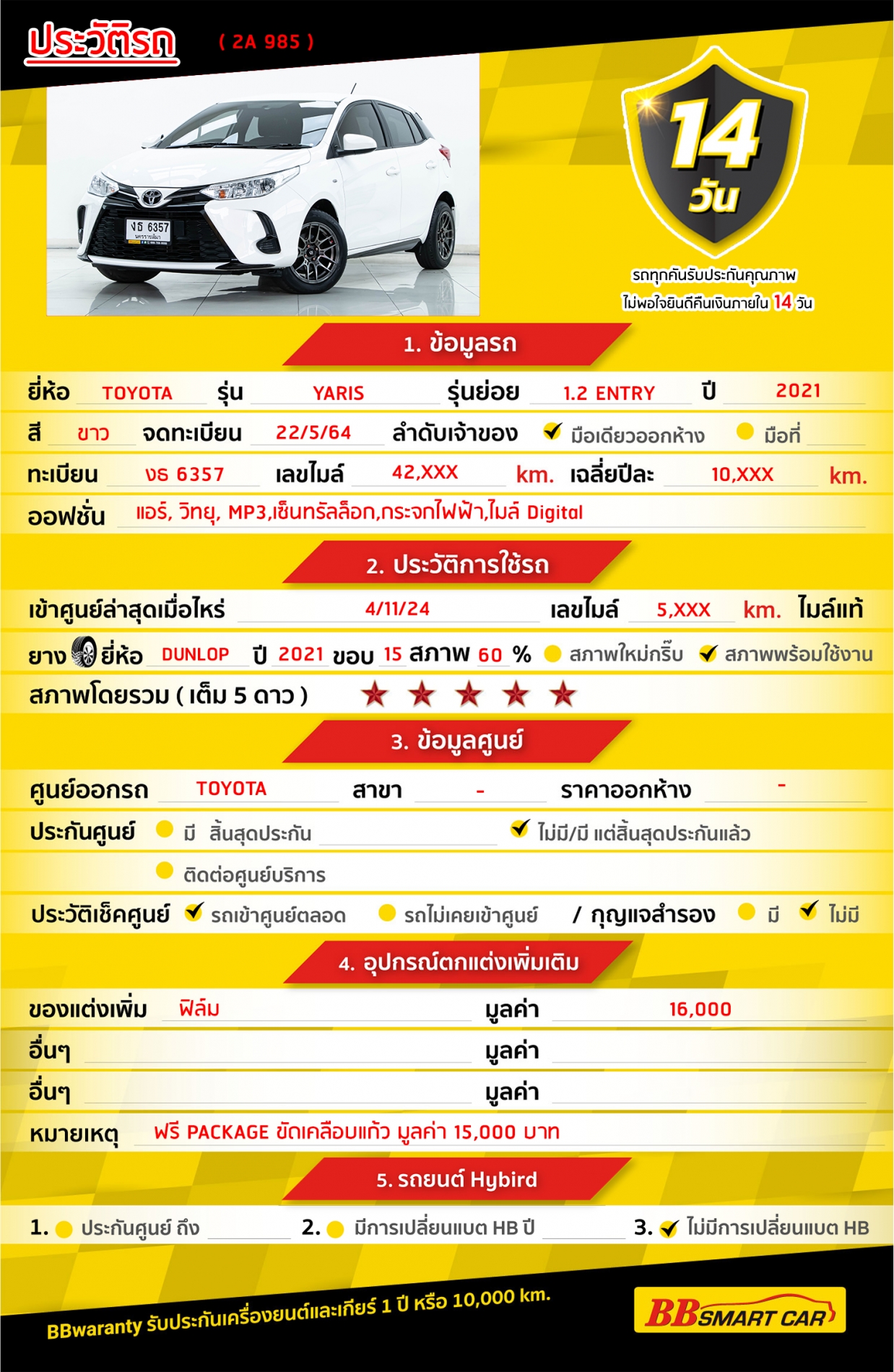 TOYOTA YARIS 1.2 ENTRY 5DR AT 2021 ออกรถ 0 บาท จัดได้ 339,000 บ Line : @bbcar02