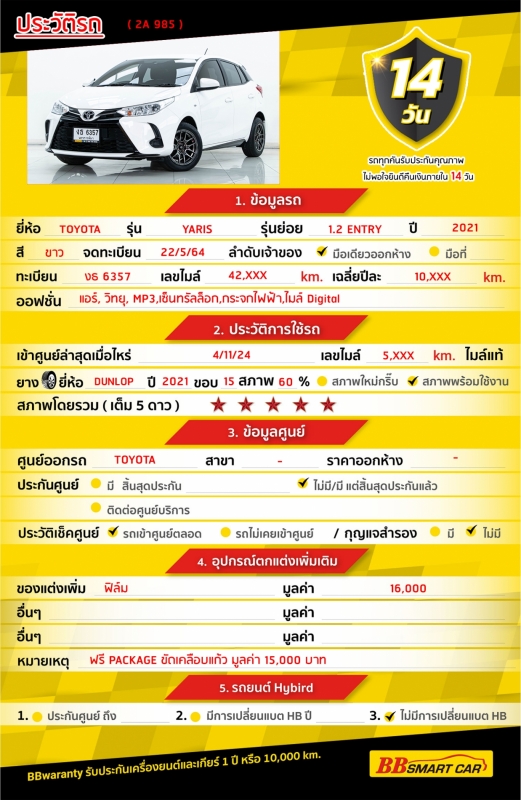 Car Hightlight มาแล้วค่ะ TOYOTA YARIS มาพร้อมรูปลักษณ์ที่ทันสมัย มีความโมเดิร์นเป็นเอกลักษณ์สะดุดตาทั้งภายนอกและภายใน พร้อมอุปกรณ์อำนวยความสะดวกครบครัน ช่วงล่างที่แน่น ทำให้เกาะถนน และมีการทรงตัวที่ดี ทำให้ขับขี่ได้อย่างมั่นใจและรู้สึกปลอดภัย สภาพป้ายแดงค่ะ ราคาไม่แพง ไมล์น้อย รถดูแลศูนย์ตลอดค่ะ