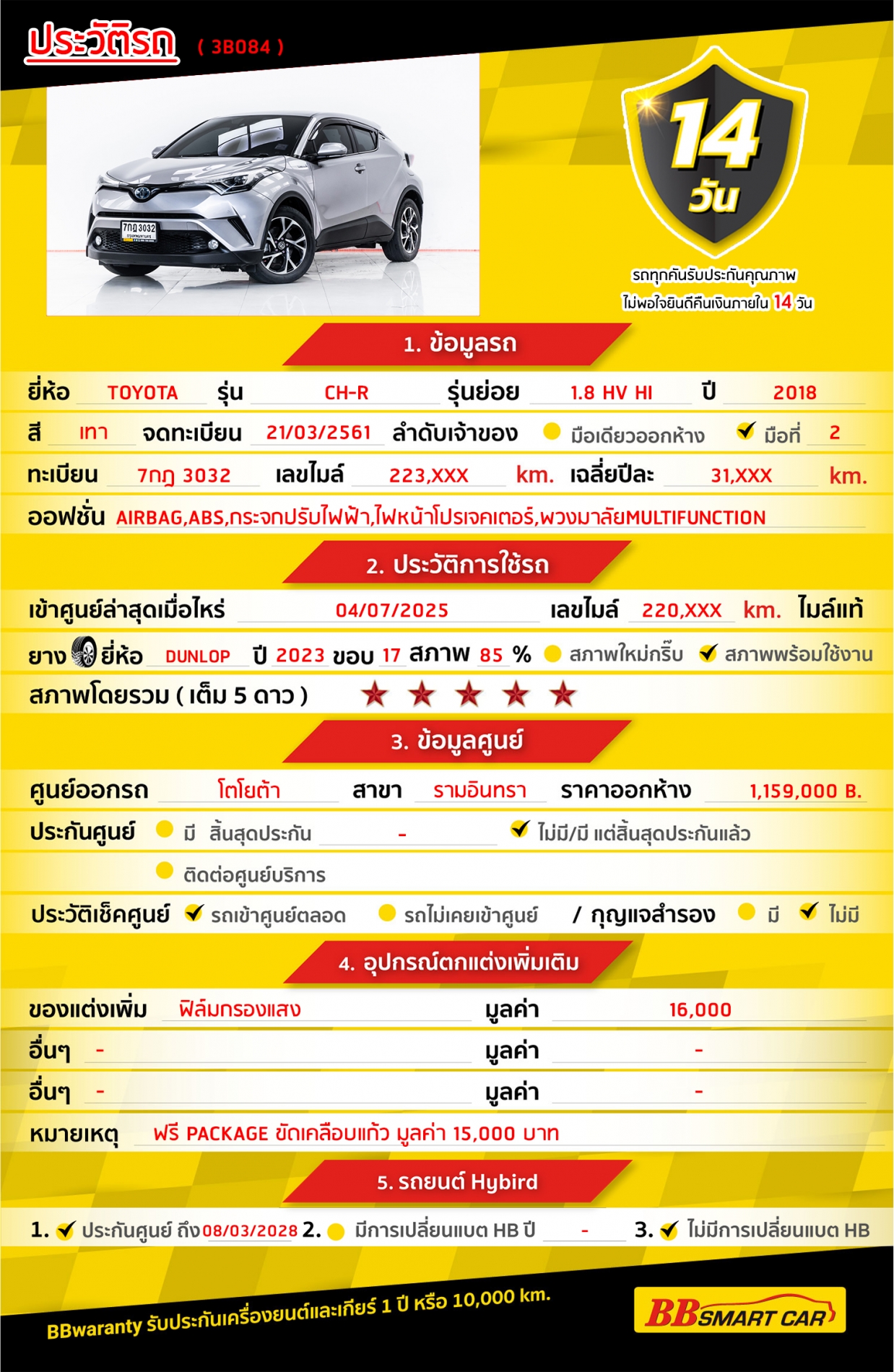 - การรับประกันหลังการขาย BBwarranty ดูแลเครื่องยนต์และเกียร์ นาน 2 ปี หรือ 20,000 กิโลเมตร ด้วยช่างที่ผ่านการอบรมจากศูนย์ชั้นนำของประเทศ