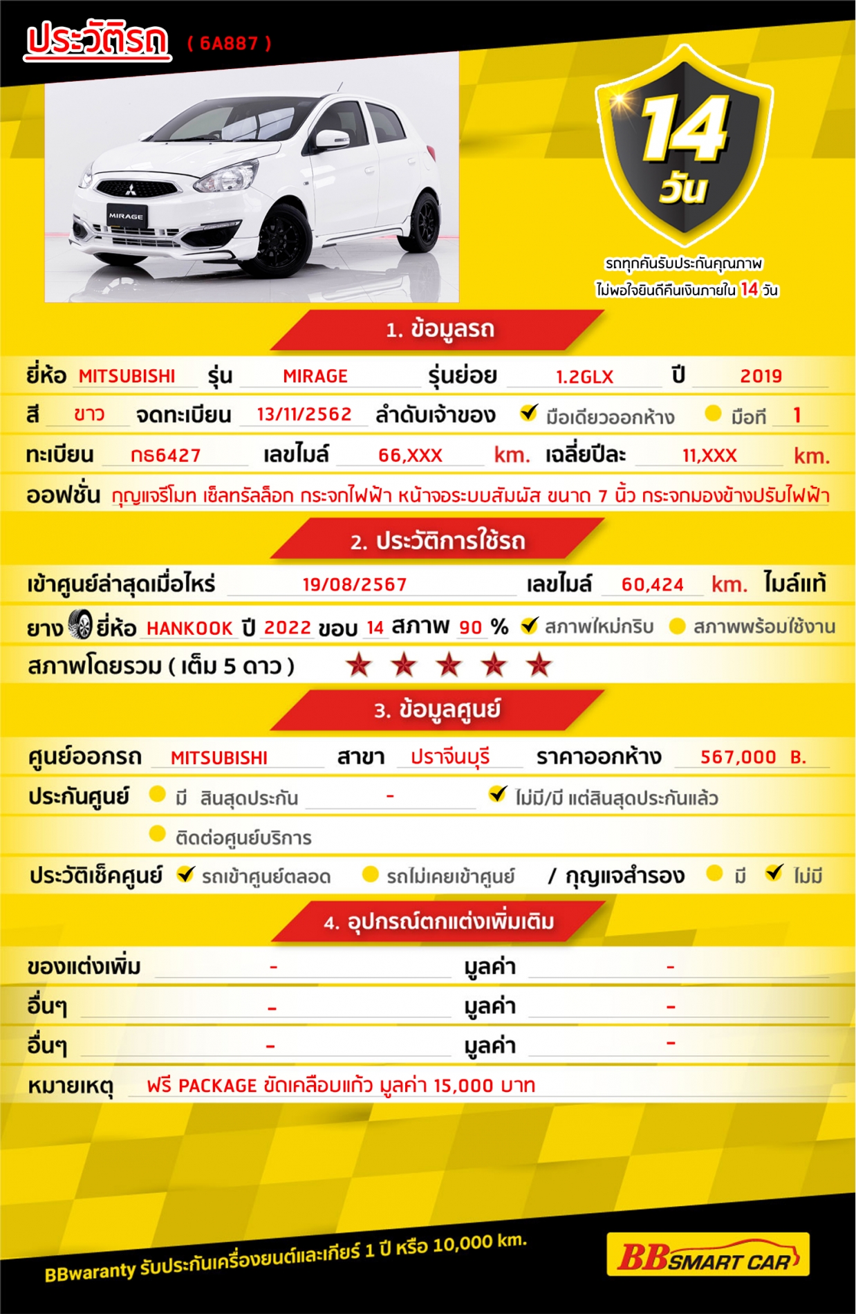 การรับประกันหลังการขาย BB Care Plus สูงสุด 2 ปี หรือ 20,000 km. ด้วยช่างที่ผ่านการอบรมจากศูนย์ชั้นนำของประเทศ