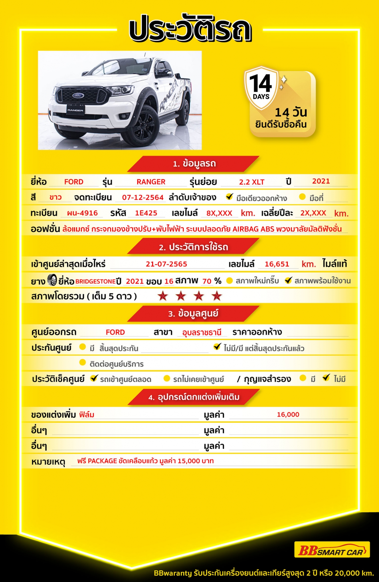 - BB Care Plus รับประกันหลังการขาย สูงสุด 2 ปี หรือ 20,000 km.