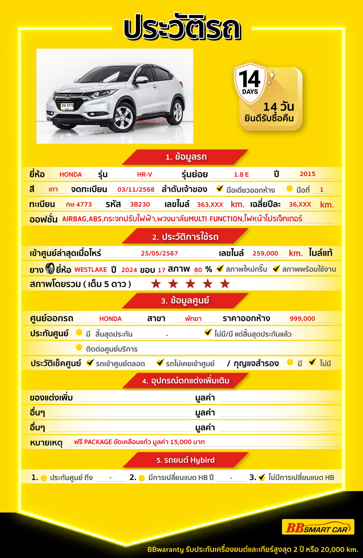 - การรับประกันหลังการขาย BBwarranty ดูแลเครื่องยนต์และเกียร์ นาน 2 ปี หรือ 20,000 กิโลเมตร ด้วยช่างที่ผ่านการอบรมจากศูนย์ชั้นนำของประเทศ