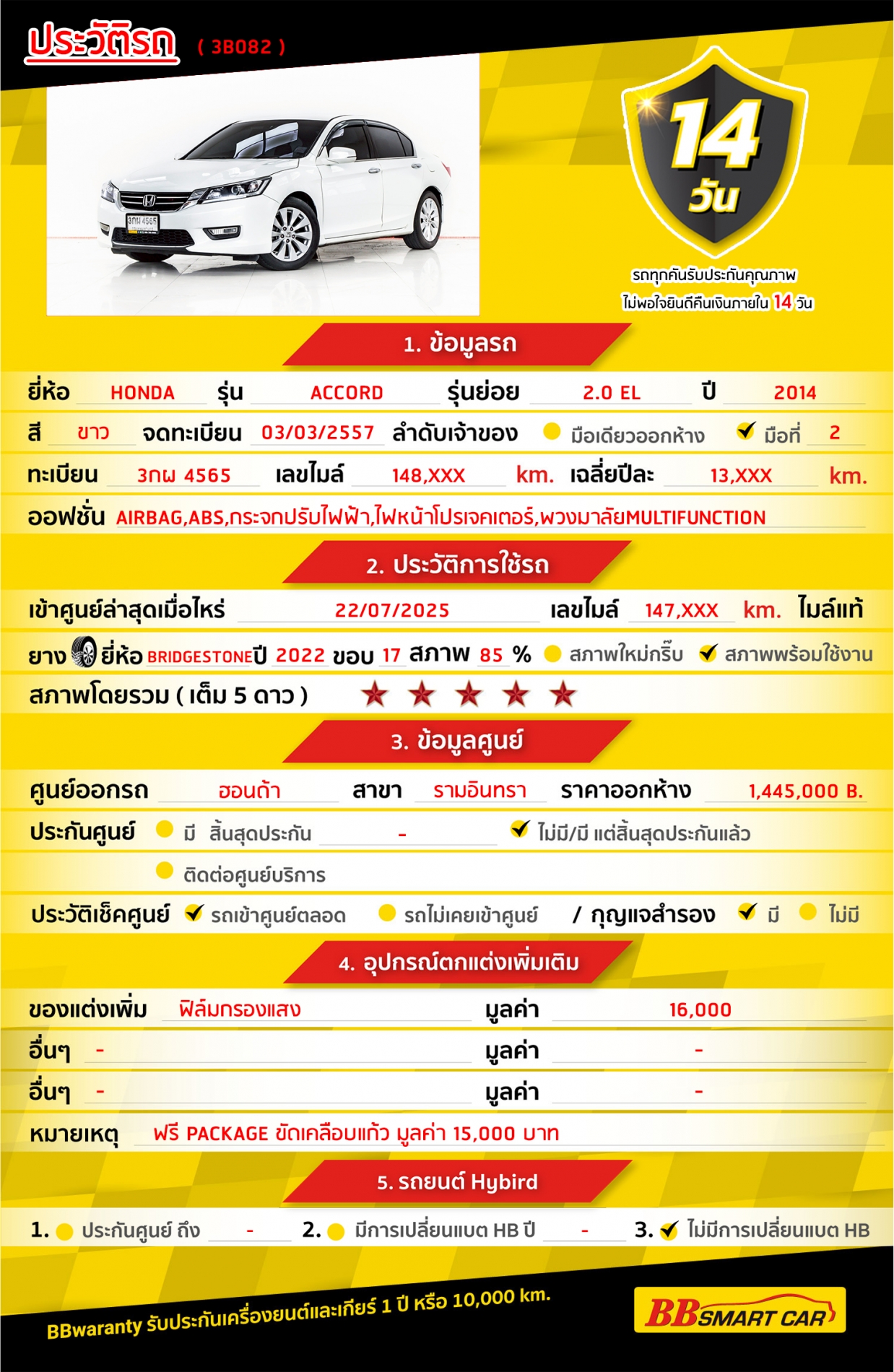 - การรับประกันหลังการขาย BBwarranty ดูแลเครื่องยนต์และเกียร์ นาน 2 ปี หรือ 20,000 กิโลเมตร ด้วยช่างที่ผ่านการอบรมจากศูนย์ชั้นนำของประเทศ