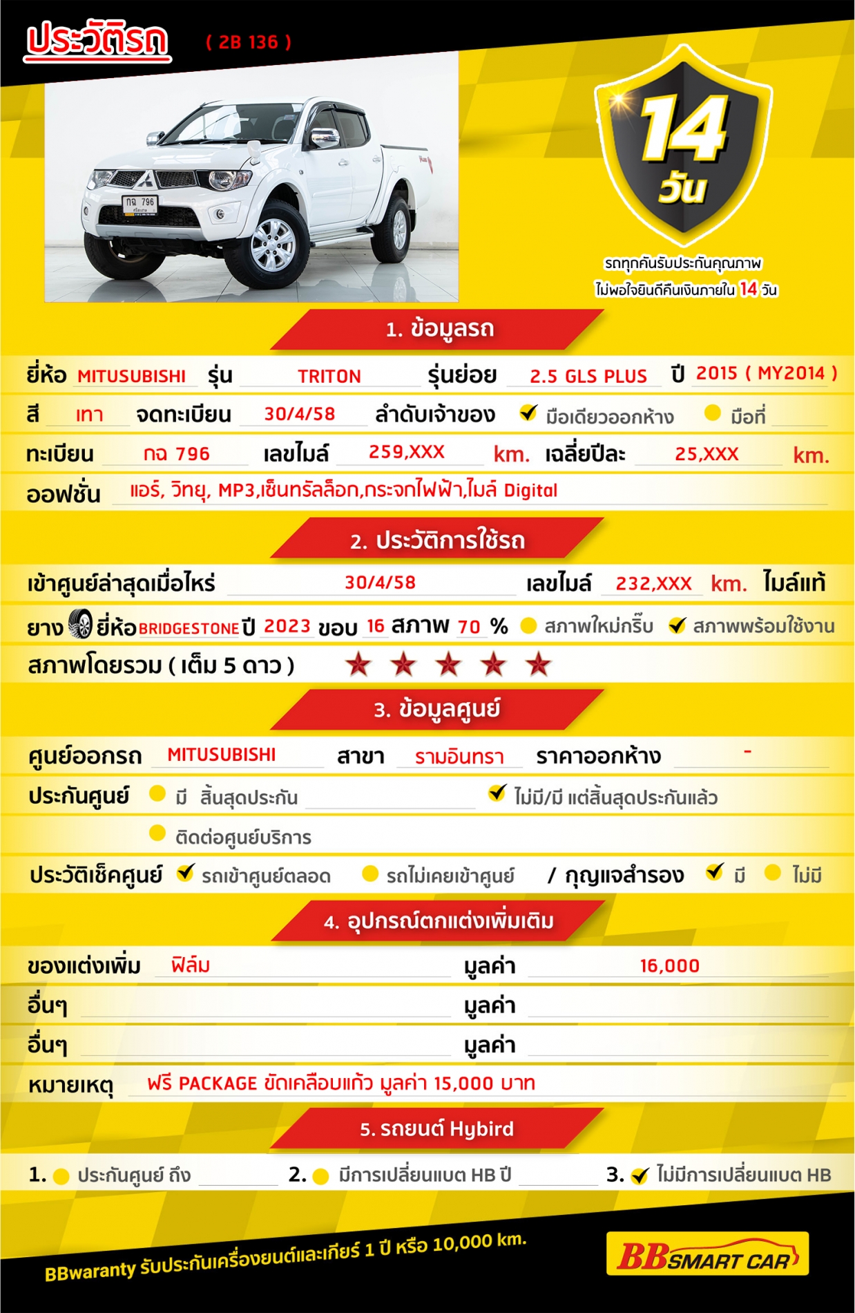 การรับประกันหลังการขาย BB Care Plus สูงสุด 2 ปี หรือ 20,000 km. ด้วยช่างที่ผ่านการอบรมจากศูนย์ชั้นนำของประเทศ