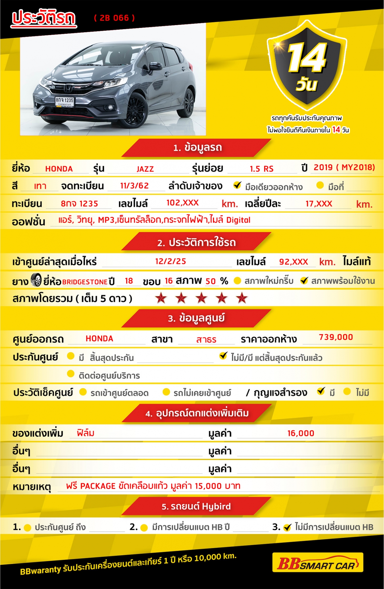 การรับประกันหลังการขาย BB Care Plus สูงสุด 2 ปี หรือ 20,000 km. ด้วยช่างที่ผ่านการอบรมจากศูนย์ชั้นนำของประเทศ