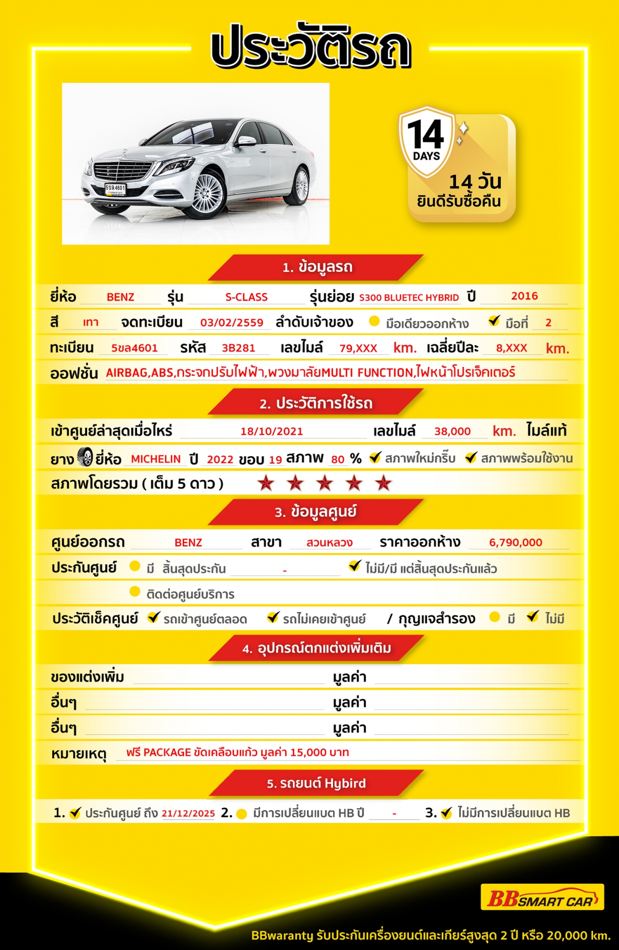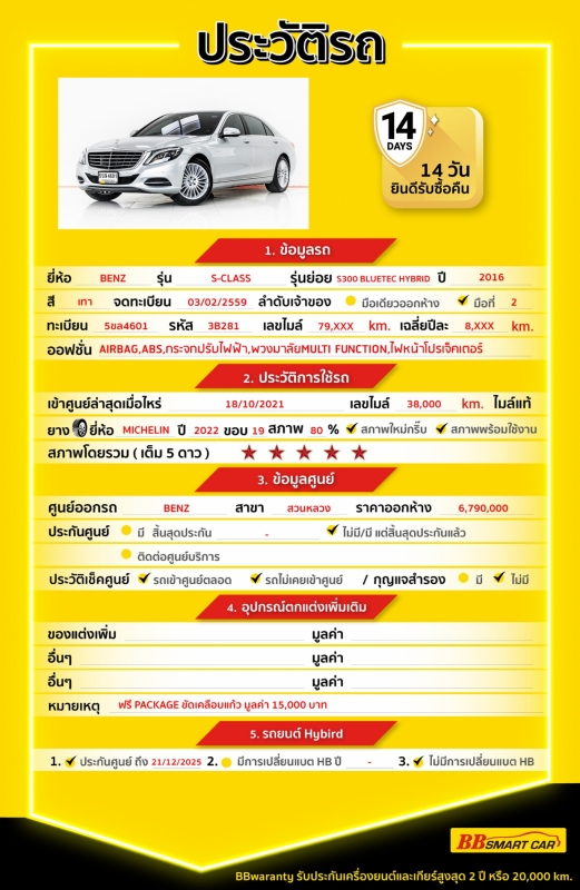 - การรับประกันหลังการขาย BBwarranty ดูแลเครื่องยนต์และเกียร์ นาน 2 ปี หรือ 20,000 กิโลเมตร ด้วยช่างที่ผ่านการอบรมจากศูนย์ชั้นนำของประเทศ