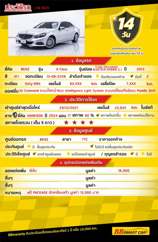 - การรับประกันหลังการขาย BB Care Plus สูงสุด 2 ปี หรือ 20,000 km. ด้วยช่างที่ผ่านการอบรมจากศูนย์ชั้นนำของประเทศ