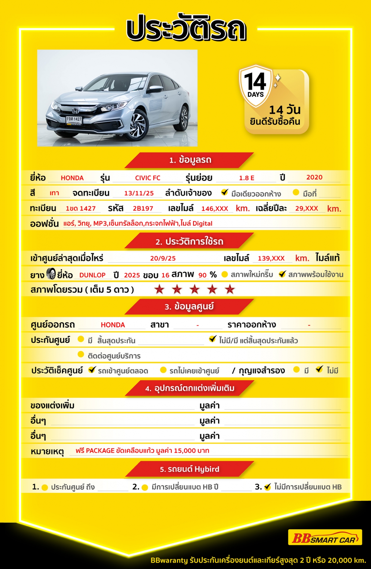 HONDA CIVIC 1.8 E AT 2020 ออกรถ 0 บาท จัดได้ 499,000 บ Line : @bbcar02
