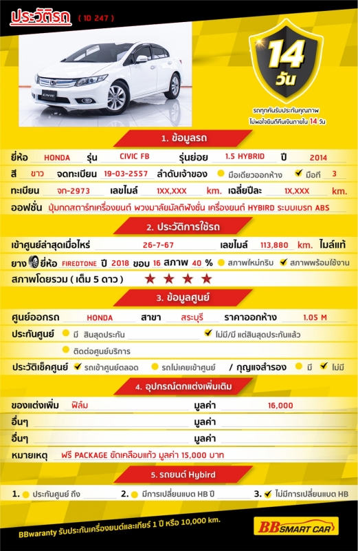 - การรับประกันหลังการขาย BB Care Plus สูงสุด 2 ปี หรือ 20,000 km. ด้วยช่างที่ผ่านการอบรมจากศูนย์ชั้นนำของประเทศ
