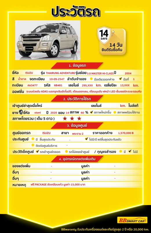 Car Hightlight มาแล้วค่ะTHAIRUNG ADVENTURE 3.0 MASTER HI-CLASS ADVENTURE 2004 เครื่องดีเซล ระบบช่วยขับ ADAS เช่น เบรกฉุกเฉินอัตโนมัติ, เตือนออกเลน, เตือนมุมอับ รถไมล์แท้ ไม่มีชนหนัก ไม่มีน้ำท่วม