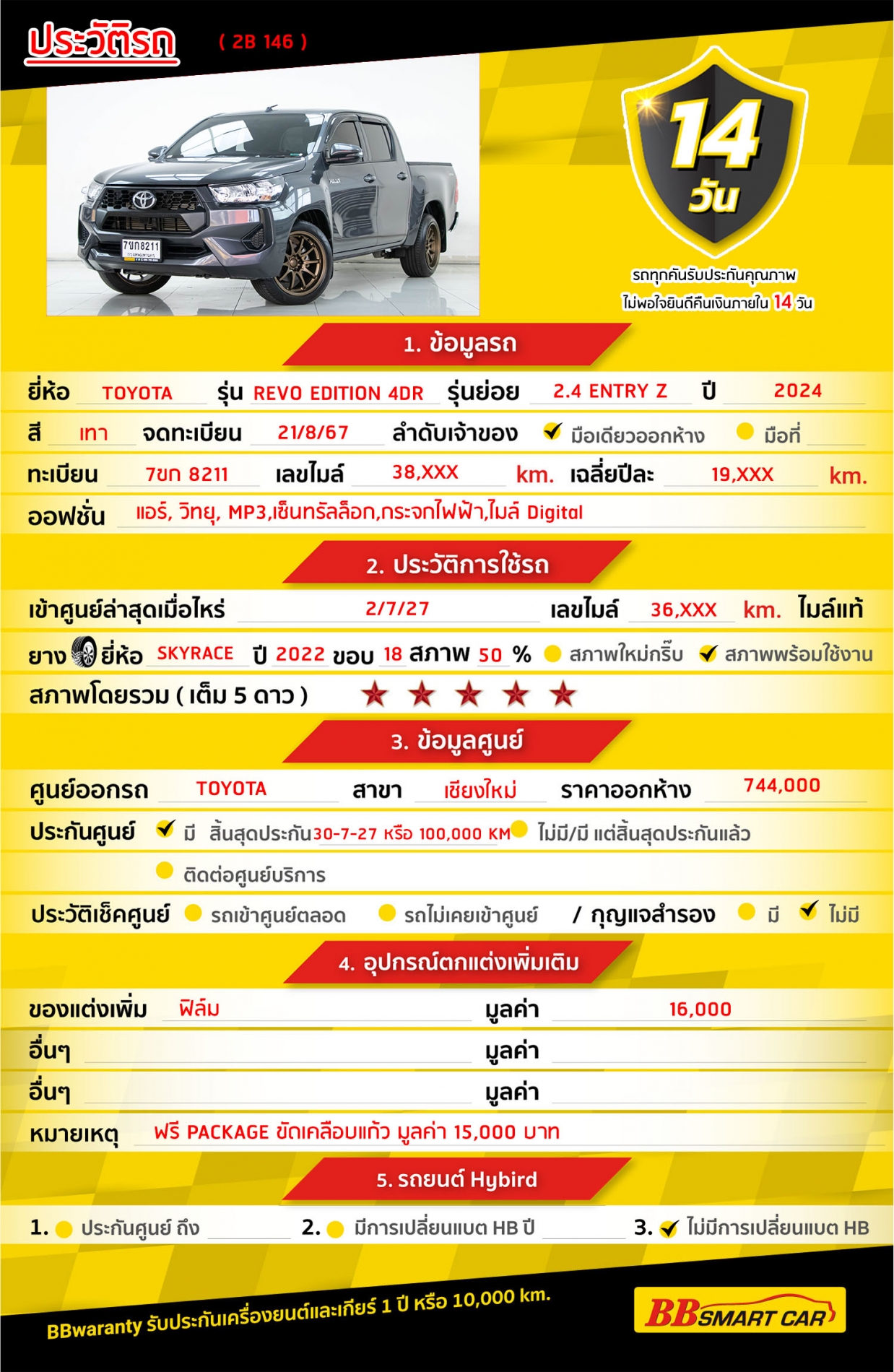 ⭐️การรับประกันหลังการขาย BB Care Plus สูงสุด 2 ปี หรือ 20,000 km. ด้วยช่างที่ผ่านการอบรมจากศูนย์ชั้นนำของประเทศ