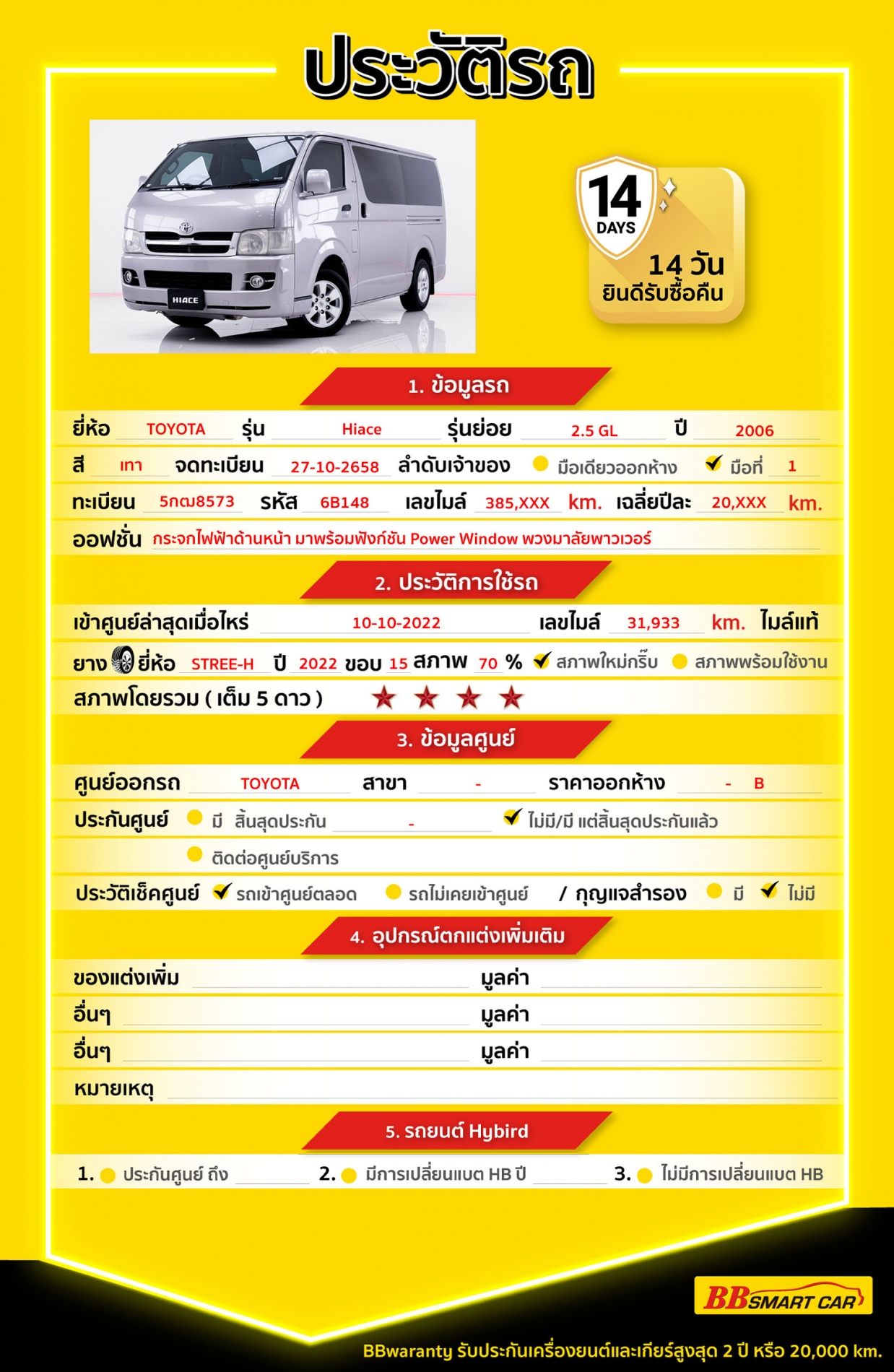 ประวัติข้อมูลรถ : เป็นรถใช้แล้ว ตัวรถไม่มีอุบัติเหตุหรือน้ำท่วม