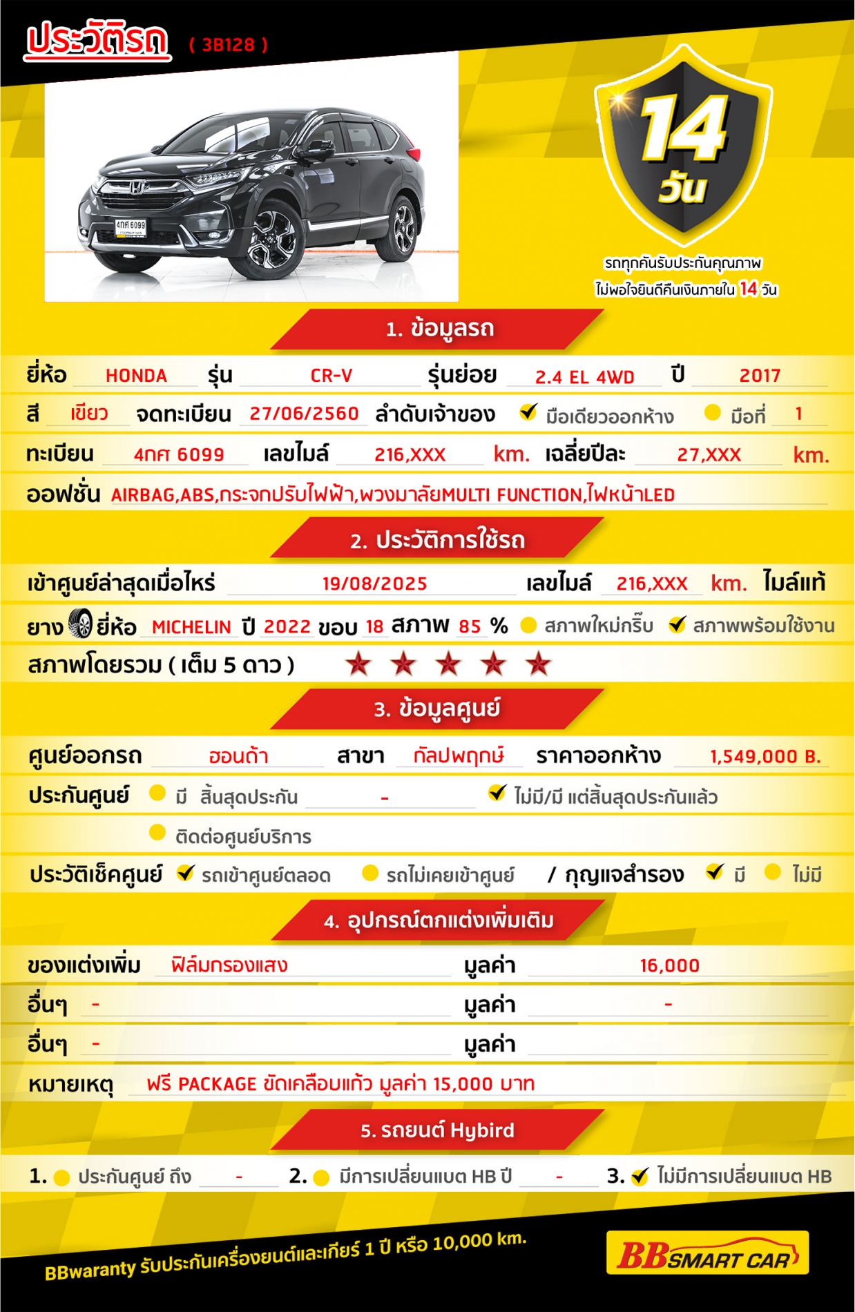 - การรับประกันหลังการขาย BBwarranty ดูแลเครื่องยนต์และเกียร์ นาน 2 ปี หรือ 20,000 กิโลเมตร ด้วยช่างที่ผ่านการอบรมจากศูนย์ชั้นนำของประเทศ