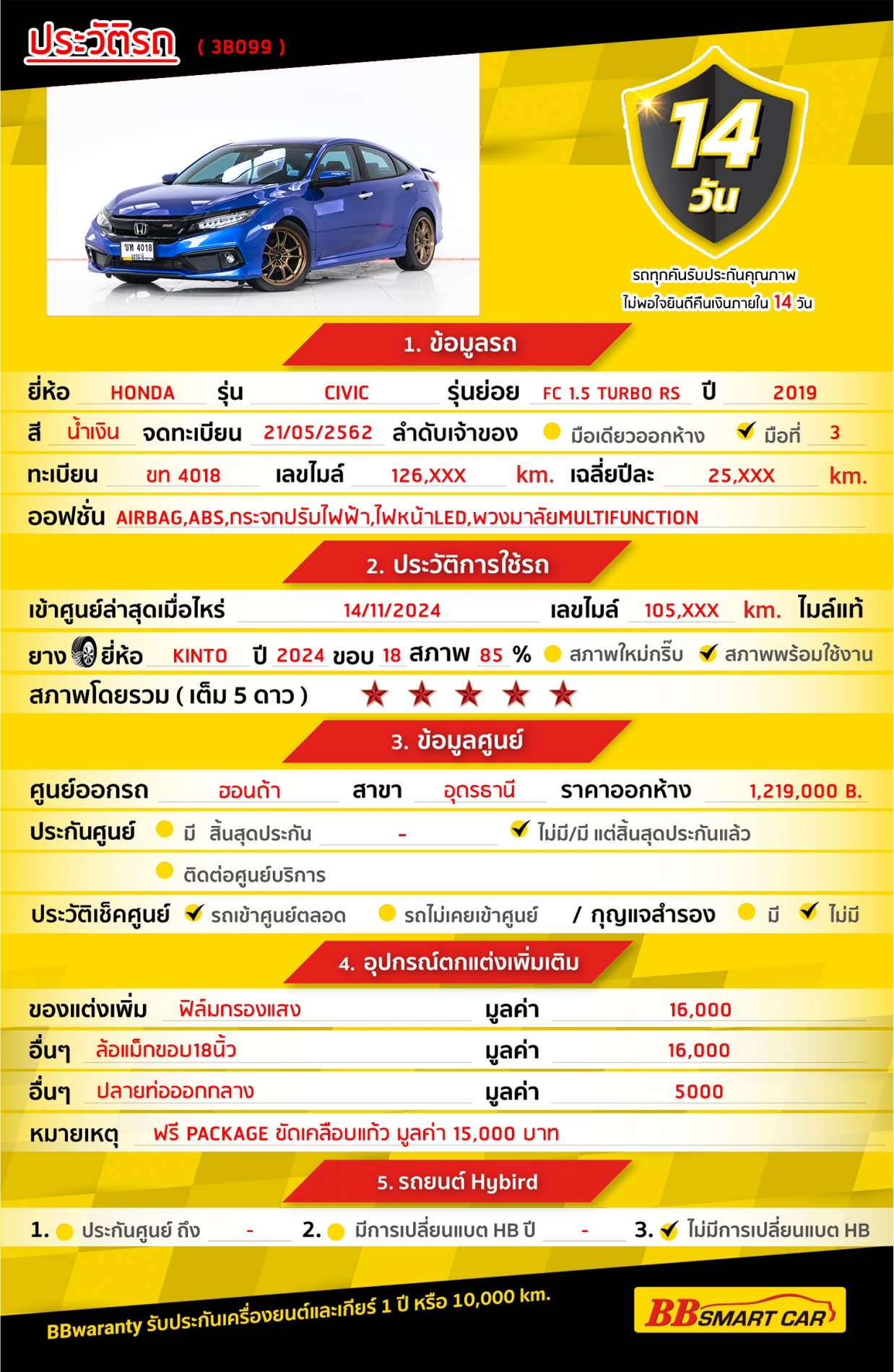 - การรับประกันหลังการขาย BBwarranty ดูแลเครื่องยนต์และเกียร์ นาน 2 ปี หรือ 20,000 กิโลเมตร ด้วยช่างที่ผ่านการอบรมจากศูนย์ชั้นนำของประเทศ