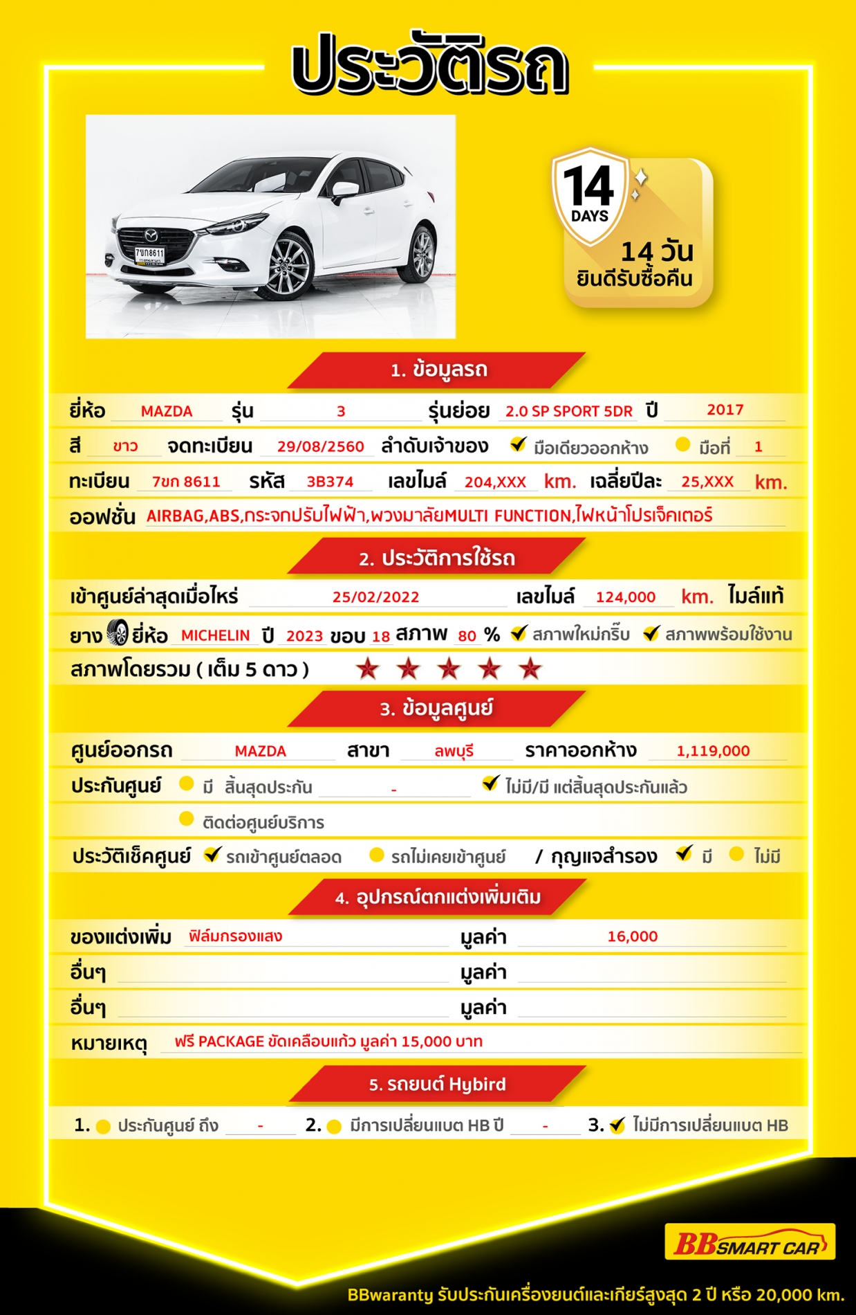 - การรับประกันหลังการขาย BBwarranty ดูแลเครื่องยนต์และเกียร์ นาน 2 ปี หรือ 20,000 กิโลเมตร ด้วยช่างที่ผ่านการอบรมจากศูนย์ชั้นนำของประเทศ