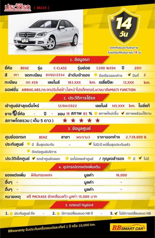 - การรับประกันหลังการขาย BBwarranty ดูแลเครื่องยนต์และเกียร์ นาน 2 ปี หรือ 20,000 กิโลเมตร ด้วยช่างที่ผ่านการอบรมจากศูนย์ชั้นนำของประเทศ
