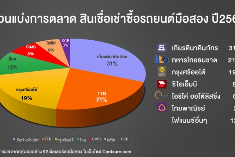 จากการเก็บข้อมูลยอดขายจากกลุ่มตัวอย่าง 92ดีลเลอร์ หรือ ผู้ประกอบการรถยนต์ใช้แล้ว 92 ราย ในปี2565ที่ผ่านมาพบว่าส่วนแบ่งการตลาดสินเชื่อเช่าซื้อรถยนต์ใช้แล้ว หรือรถมือสอง มีดังนี้